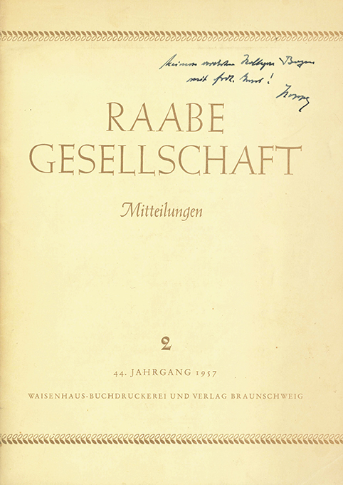Raabe – Hoppe, Karl, Die Lebensidee Raabes. Vortrag auf der Hauptversammlung der Raabe-Gesellschaft am 16. Sep. 1956. S. 38 – 53 in: Mitteilungen der Raabe-Gesellschaft 2/1957. (44 S.), OBrosch. (diese u. Papier wie immer stellenw. nachgedunkelt). Insgesamt gutes Exemplar. * Umschlag mit eigenhänd. Widmung Hoppes für einen „verehrten Kollegen“. – Enth. weitere Aufsätze über Raabe.