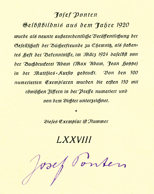 Ponten, Josef, Selbstbildnis aus dem Jahre 1920. (= Bekenntnisse. Eine Schriftenfolge von Lebens- und Seelenbildern heutiger Dichter, Folge 7). Chemnitz, Gesellschaft der Bücherfreunde 1924. Gr.-8°. 15, (5) S., OBrosch. (diese deutlich angestaubt). Innen tadellos. EA (nicht bei WG²). * 9. außerordentliche Publikation der Gesellschaft. Eins von 150 (ges. 500) in der Presse römisch nummer. Exemplaren der Vorzugsausgabe, welche im Druckvermerk von Ponten mit lilafarbener Tinte signiert wurde.