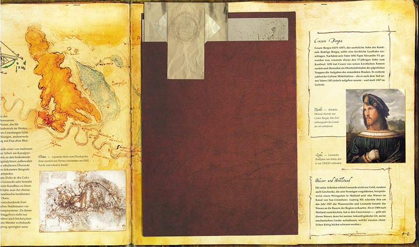 Leonardo da Vinci – Landrus, Matthew, Leonardo da Vinci. (Mit 30 entnehmbaren Objekten). München, ars edition (arsEdition) 2007. 30,5 x 26,5 cm (quer). 66 S. mit zahlr. farb. Abbildungen, OPp. Tadelloses Exemplar im farb. illustr. Schmuckschuber. DEA. * Der sehr aufwändig hergestellte Band enthält insges. 30 entnehmbare farbige Faksimiles in verschiedenen Formaten u. unterschiedlichem Umfang, teils in Taschen in den Buchseiten verwahrt, teils montiert, teils in eingeklebten Kuverts. – „Dieses Buch erzählt die Geschichte des außergewöhnlichen Künstlers und Ingenieuers vor dem Hintergrund einer faszinierenden Epoche.“ (Einband)