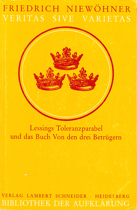 Lessing – Niewöhner, Friedrich, Veritas sive Varietas. Lessings Toleranzparabel und das Buch Von den drei Betrügern. (= Veröffentlichung der Lessing-Akademie Wolfenbüttel). Heidelberg, Lamberg Schneider 1988. Gr.-8°. 430, (2) S., OKlappenbrosch. (geringe Gbrsp., Schnitt teils stockfl.) Namenszug, sehr wenige (leicht ausradierbare) Bleistiftanstr. Insges. wohlerhalten. Beiliegt eine ausführl. Zeitungsrezension dieses Buches. EA.