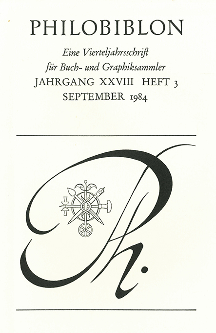 Finsterer – Scheffler, Christian, Alfred Finsterer. Buch- und Schriftkunst. UND: Heinrich Geissler, Von Hexen, Gauklern und erträumten Paradiesen. Anmerkungen zur freien Graphik von Alfred Finsterer. S. 197 – 228 mit 62 Abbildungen im Text u. auf (teils farbigen) Tafeln in: Philobiblon. Eine Vierteljahresschrift für Buch- u. Graphiksammler. Heft 3/1984. Gr.-8°. (104 S.), illustr. OKt. Sehr gutes Exemplar.