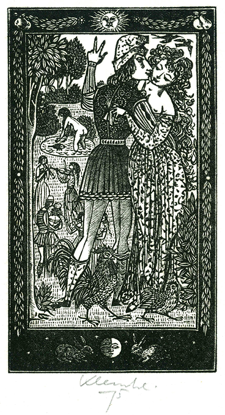 Klemke – Boccaccio, Giovanni, Das Dekameron. Übertr. von August Wilhelm Schlegel (Tage 1 – 3) u. Karl Witte (Tage 6 – 10). Mit 105 Holzstichen von Werner Klemke. Zwei Bände. Berlin, Aufbau-Verlag 1975. 7. Aufl. 665, (3) u. 577, (3) S., OLdrbde. (3 kaum sichtbare kleine, allerfeinste feinste Kratzspuren). Sonst tadellos. Vgl. Kunze 241 u. Tiessen 40. * Vorzugsausgabe in zwei roten Ganzlederbänden mit Goldprägung. Mit einem beiliegenden Orig.-Holzstich auf feinstem Japanpapier (minim. knittrig), von Klemke signiert u. datiert. – Die erste Auflage wurde 1958 als „schönstes Buch der DDR“ ausgezeichnet, 1965 auf der Buchausstellung Leipzig mit der Goldmedaille prämiiert.