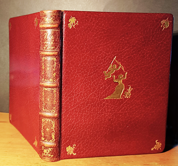 Godard d’Aucourt, (Claude), Themidor. [Meine Geschichte und die meiner Geliebten]. Übertr. von Heinrich Töpfer. Mit 15 in zarten Farben handkolorierten Orig.-Lithographien von Werner Schmidt (1 illustr. Titelblatt, 8 Tafeln, 6 kleinere Illustrationen zu Beginn der Kapitel). München, Hyperion (1921). 13 x 16 cm. 195 S., bordeauxfarbener OLdr. mit goldgepr. Deckelvignette u. Zierrat sowie Kopfgoldschnitt (Rücken etw. nachgedunkelt u. leicht berieben). Sonst tadelloses Exemplar im (stellenw. verblassten) Schuber mit lithograph. Deckel- u. Rückenschild. 1. Auflage. Diese Ausgabe nicht bei Hayn-Gotendorf. * Eins von 200 nummer. Exemplaren der Vorzugsausgabe im hübschen Ganzlederband, vom Künstler im Colophon signiert. – Vorwort von Guy de Maupassant, der diesen erotischen Roman, das bekannteste Werk Godard d’Aucourts, als „Ein Meisterwerk! Und davon gibt es wenige.“ bezeichnet. „O, er ist recht unartig, unmoralisch, gepfeffert – für unsere Sittenprediger, die voller Gedanken und Schamhaftigkeitsrezepte selbst gegen den Rundtanz wüten!“