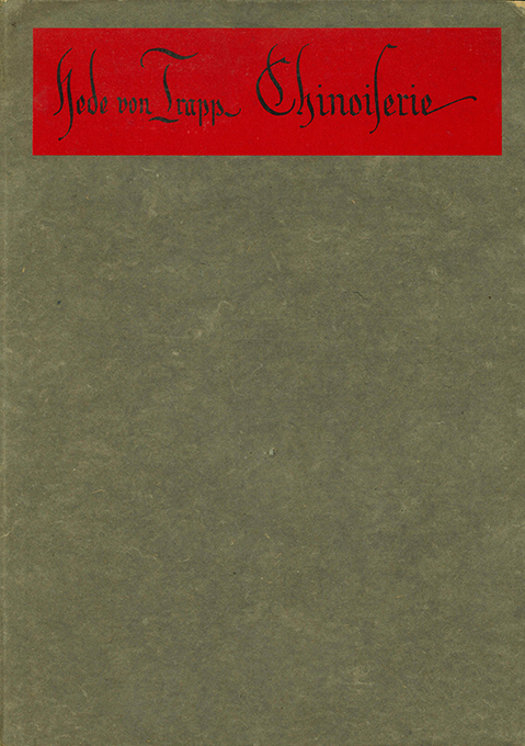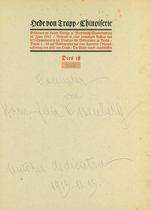 Trapp, Hede von, Chinoiserie. Worpswede/Charlottenburg, Horen-Verlag 1913. 23 x 32 cm. 18, (2) S., OPp. mit Pergamentpapierumschlag (dieser nachgedunkelt u. mit größeren Fehlstellen im Rand; die Zeichnung davon nicht betroffen). Eine Ecke bestoßen, Papier etwas stockfl. Insgesamt gutes Exemplar. Selten, mit dem Umschlag extrem selten, ebenso Handschriftliches von Hede von Trapp. EA. * Eins von 875 Exemplaren, dieses statt einer Nummerierung mit eigenhänd. Widmung der österreichischen Dichterin, Malerin und Grafikerin des Jugendstils: „[Dies ist] das Exemplar von Herrn Felix Eisenberg / Autoris dedication / 1913.11.13.“ – Die drei Erzählungen wurden in Rot u. Schwarz auf getöntes Hadernpapier gedruckt. Umschlag mit einer Zeichnung der Autorin. – Die angegebene Auflagenhöhe ist mit an Sicherheit grenzender Wahrscheinlichkeit völlig überzogen, ansonsten wäre dieses Werk nicht so selten.