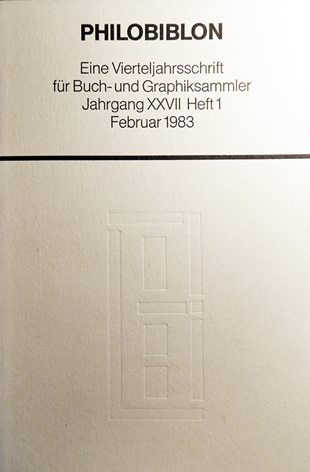 Typographie – Boghardt, Martin, „Der in der Buchdruckerei wohl unterrichtete Lehr-Junge“. Bibliographische Beschreibung der im deutschsprachigen Raum zwischen 1608 und 1847 erschienenen typographischen Lehrbücher. S. 5 – 57 (!) in: Philobiblon. Eine Vierteljahresschrift für Buch- u. Graphiksammler. Heft 1/1983. Gr.-8°. 95, (13) S. mit Abbildungen, OKt. mit einer Blindprägung von Kurt Londenberg. Gutes Exemplar. * Weit. Beitr. von Horst Gronemeyer (Das Ende der Bücher?), H. Walravens (Zwei frühe Beispiele volkstümlicher chinesischer Prosa) u.a.