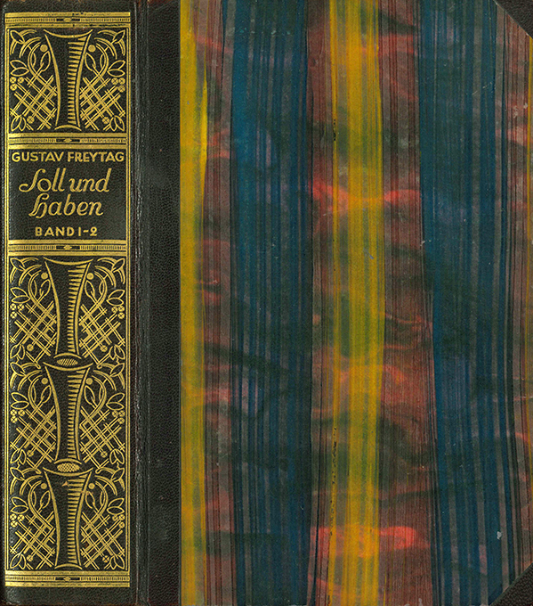Freytag, Gustav, Soll und Haben. Roman in sechs Büchern. Hrsg. u. Nachwort von Heinrich Spiero. Zwei Bände in einem Band. Berlin, Wegweiser-Verlag (um 1930). 487 + 355, (3) S. mit Titelporträt u. 3 Tafeln, OHalblederbd. mit reicher Rückenvergoldung u. handgefert. Kleister-Überzugspapier (etw. schiefgelesen). Schnitt etw. stockfl. Insges. gutes Exemplar der dekorativen Ausgabe.