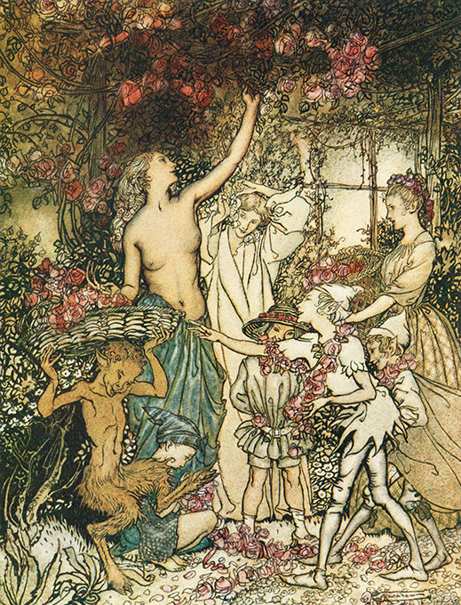 Rackham – The Springtide of Life. Poems of Childhood by Algernon, Charles, Swinburne. With a Preface by Edmund Gosse. Illustrated by Arthur Rackham. London, Heinemann 1918. 19 x 25,5 cm. 132, (2) S. mit zahlr. Zeichnungen u. Vignetten + 7 Farbtafeln, vorgeschaltet jeweils ein Zwischenblatt mit Bildtitel, illustr. OLwd. mit Goldpr. (etw. berieben u. bestoßen, Kopfkapital mit kl. Läsuren). Vorsatz mit Exlibris u. Namenszug von alter Hand. Insges. ziemlich gutes Exemplar. EA.