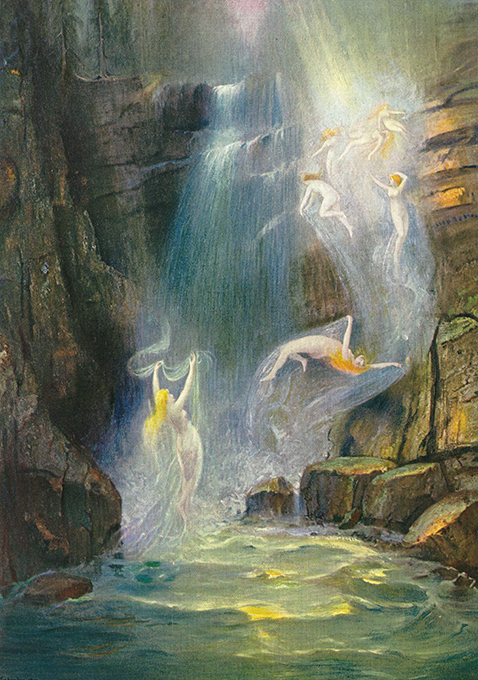 Rübezahl – Wille, Bruno, Die Sagenhalle des Riesengebirges (Schreiberhau). Der Mythus von Wotan-Rübezahl in Werken der bildenden Kunst. Acht Bilder von Hermann Hendrich. Standbild von Hugo Schuchardt. Bauwerk von Paul Engler. Leipzig, Buchdruckerei der Illustrirten Zeitung J.J. Weber 1903. 4°. 16 S. mit 2 Abbildungen, rot gedruckter Initiale u. Schlussstück + 8 Farbtafeln, OKt. mit textilem Rücken. Einband, das erste u. die letzte Tafel auf der Rückseite zart stockfl. Insges. gutes Exemplar. Selten. EA.