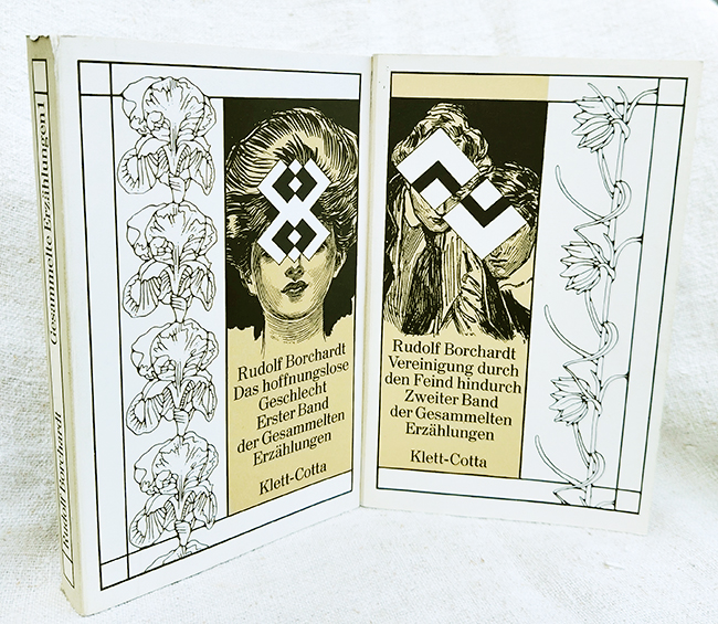 Borchardt, Rudolf, Gesammelte Erzählungen. Hrsg. von Marie Luise Borchardt unter Mitarbeit von S. Rizzi. Zwei Bände. Stuttgart, Klett-Cotta 1977. 286, (2) u. 238, (2) S., illustr. OKtbde. (1 kl. Eckläsur). Bd. I durchgehend mit Knickspuren, das erste Bl. jeweils mit Stempel des Prüfungsausschusses für Schülerlesebüchereien. Insges. wohlerhalten. 1. Auflage. * I. Das hoffnungslose Geschlecht (4 Erzählungen); Kleine Erzählungen (2 Erzählungen. II. Vereinigung durch den Feind hindurch. Roman.