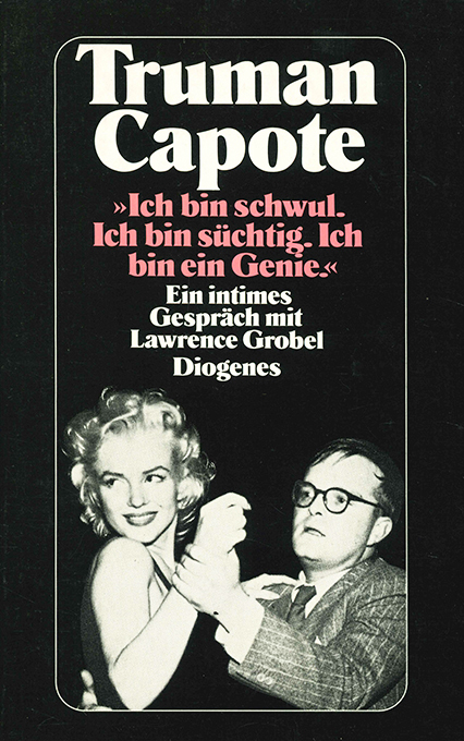 Capote, Truman, Ich bin schwul. Ich bin süchtig. Ich bin ein Genie. Ein intimes Gespräch mit Lawrence Grobel. Vorwort von James A. Michener. Übertr. von Thomas Lindquist. Zürich, Diogenes 1988. Kl.-8°. 257, (13) S., davon 12 S. Abbildungen, illustr. OKt. (Rücken mit lesetypischer Knickspur). Wenige zarte Bleistiftanstr., sonst gutes Exemplar. Beiliegt eine schöne Capote-Portraitpostkarte (Photo von Jill Krementz). 1. Taschenbuchauflage.