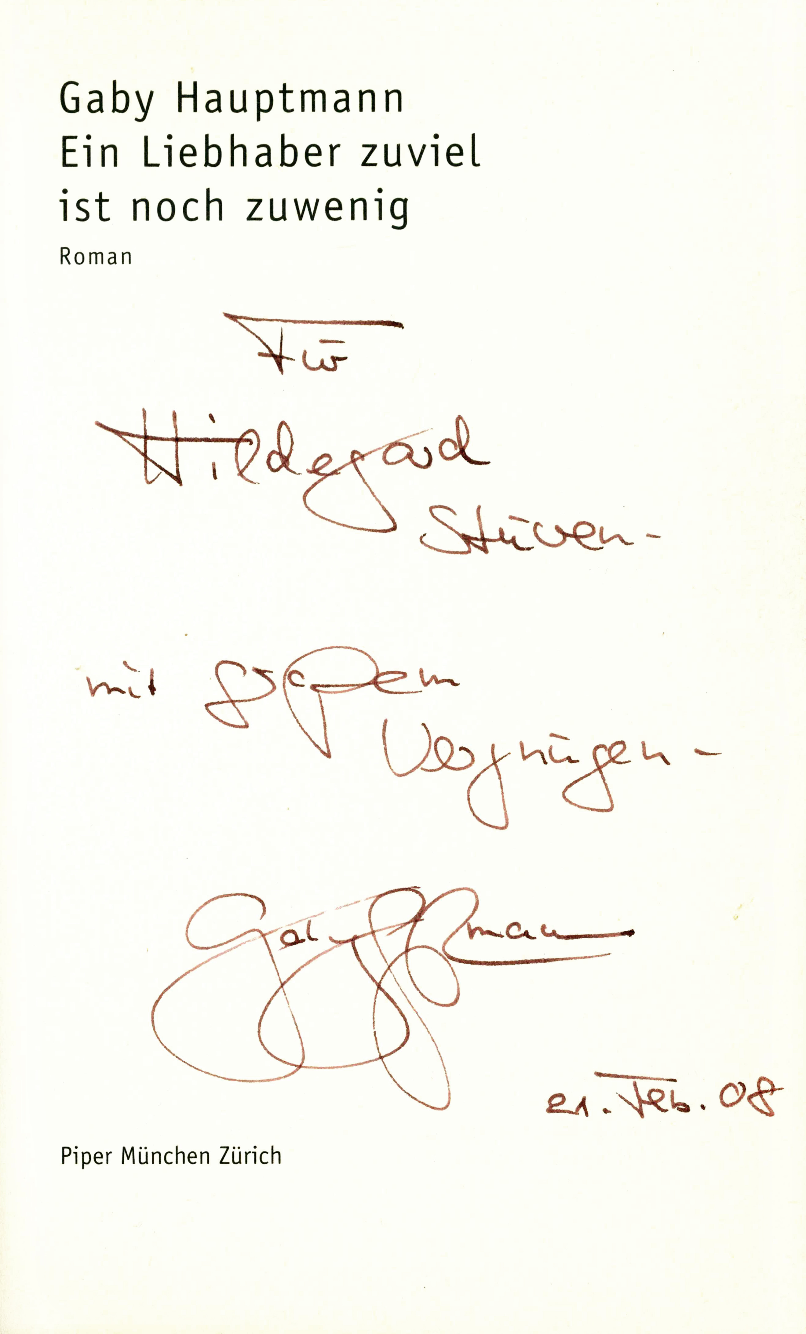 Hauptmann, Gaby, Ein Liebhaber zuviel ist noch zuwenig. Roman. München u. Zürich, Piper 2001. 8. Aufl. 316, (4) S., farb. illustr. OKt. Gutes Exemplar. * Titelblatt mit sechszeil. eigenhänd. Widmung: „Für Hildegard Stüven – mit großem Vergnügen – Gaby Hauptmann. 21. Feb. 08“