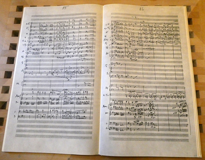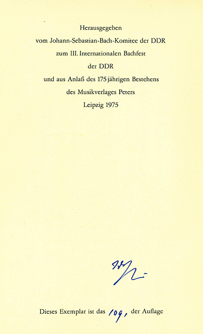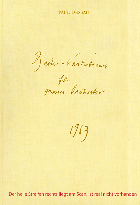 Dessau, Paul, Bach-Variationen für großes Orchester. 1963. Faksimile nach dem Autograph. Leipzig, Edition Peters 1975. 28,5 x 48,5 cm. (6), 99 S., OSeidenband. Gutes Exemplar. * Nr. 109 der kleinen nummerierten Auflage, dieses Exemplar von Dessau signiert. Erschienen zum III. Internationalen Bachfest der DDR und aus Anlass des 175-jährigen Bestehens des Musikverlages Peters.