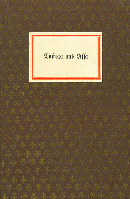 Insel-Bücherei – ÖB 3 – Friedjung, Heinrich, Custoza und Lissa. Mit einem Vorwort. (= Österreichische Bibliothek 3). Leipzig, Insel (1915). 107, (5) S., späterer Pappbd. mit gemustertem Überzugspapier, montiert das Orig.-Titel- u. -Rückenschild (dieses nachgedunkelt). Gutes Exemplar. Kästner Ö.3.
