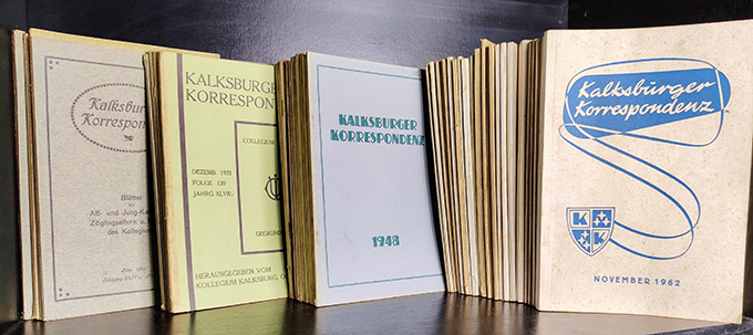 Kalksburger Korrespondenz 1928 – 1962. Blätter für Alt- und Jung-Kalksburg, Zöglingseltern u. Freunde des Kollegiums (bis 1929). Ab 1930: Herausgegeben vom Kollegium Kalksburg. 50 Hefte. Kalksburg, Selbstverlag 1928 – 1962. Zus. 3420 S. mit Abbildungen im Text + zahlr. Tafeln, OBroschuren (diese u. Schnitte teils stockfl. Insgesamt gut erhalten. * Vollständige Folge der Ausgaben Mai 1927 bis August 1938 (24 Ausgaben) u. 1948 – November 1962 (26 Ausgaben). Im Jahr 1938 wurde der Verein vom nationalsozialistischen Regime wegen seiner Nähe zum Katholizismus liquidiert und das Vermögen eingezogen. Nach Ende des zweiten Weltkrieges erwiesen sich die Altkalksburger sofort sehr aktiv und organisierten abermals gleich lose Zusammenkünfte. Auch bestärkten sie die Jesuiten, das Gymnasium in Kalksburg wieder zu eröffnen, was dann auch 1947 geschah. Im Zeitraum von 1938 und 1948 ist die Kalksburger Korrespondenz also nicht erschienen. – Beilage: Adressen alter Kalsburger. Um 1900. 24 Seiten. – Informationsquelle: Altkalsburger.org