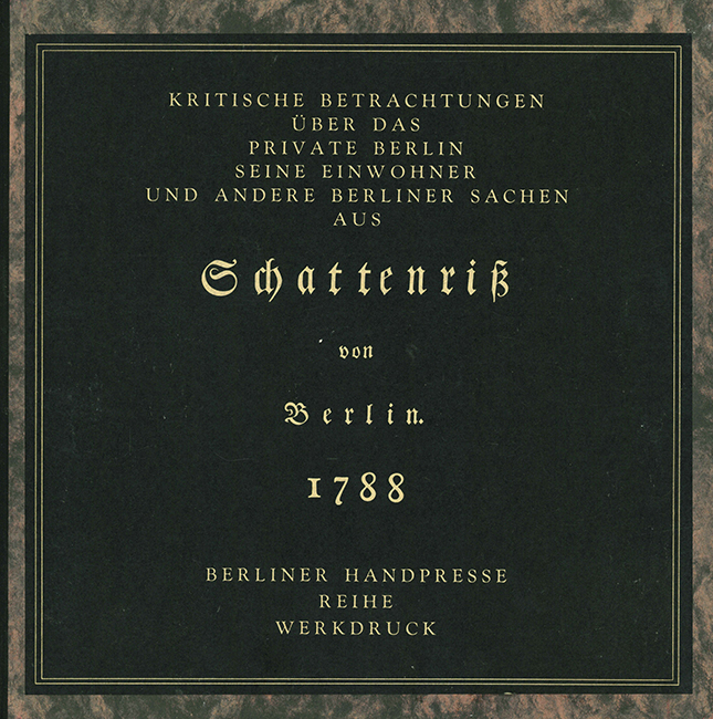 Berliner Handpresse – Kritische Betrachtungen über das private Berlin und seine Einwohner und andere Berliner Sachen. aus ‚Schattenriß von Berlin‘ 1788. Hrsg. u. mit kritischen Anmerkungen versehen von Uwe Otto. Mit 17 Illustrationen von Wolfgang Jörg u. Erich Schönig. Berlin 1975. 27,5 x 27,5 cm. 35, (7) S., OHlwd. (Blockbuchbindung). Gutes Exemplar. * Berliner Handpresse, Reihe Werkdruck No. 3. – Eins von 1200 nummer. Exemplaren, im Druckvermerk von beiden Künstlern signiert.