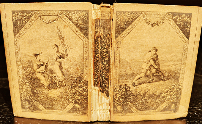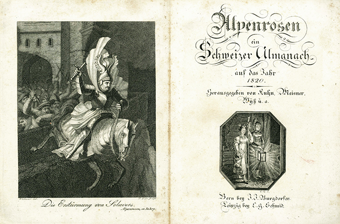Almanach – Alpenrosen, ein Schweizer Almanach auf das Jahr 1820. Hrsg. von Kuhn, Meisner, Wyss u.a. Bern, Burgdorfer u. Leipzig, Schmid (1819). 12,5 x 9,2 cm. Gest. Titelbl. mit gest. Vignette, 388, (4) S. + 7 (davon 4 gefalt.) Kupfertafeln, 3 gefalt. gestochene Notenblätter (″Geißreihen“), OPp. mit gest. Stichen auf Vorder- u. Rückdeckel (Einband gebräunt, Rücken zu etwa einem Drittel abgeplatzt). Innen weitgehend gut erhalten, nur sehr wenige Stockfl., eine Tafel im Falz etw. eingerissen. Köhring S. 22. * Auf den Kupfern dargestellt: Elly und Oswald; Der Frow Zwinglin Klag; Die Hanfbrecherinnen; Die Bärenjagd; Ansicht des Schloßes Les Clées in der Waat; Das Fest der Amorins in Neüenbürg; Die Erstürmung von Solavers.