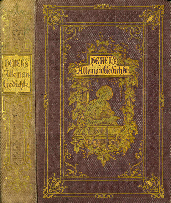 Hebel, J.P., Allemannische (sic!) Gedichte. Für Freunde ländlicher Natur und Sitten. Eilfte vollständige Original-Auflage. Aarau, Sauerländer 1860. 9,5 x 14 cm. XVI, 265, (3) S., blindgepr. OLwd. mit goldgepr. Deckelillustration u. Rücken, Ganzgoldschnitt (Rücken verblasst, Vorsätze materialbedingt etw. verfärbt). Bis auf sehr vereinzelte leichte Stockfl. sehr gutes Exemplar.