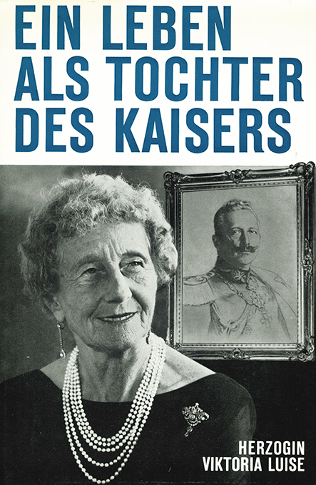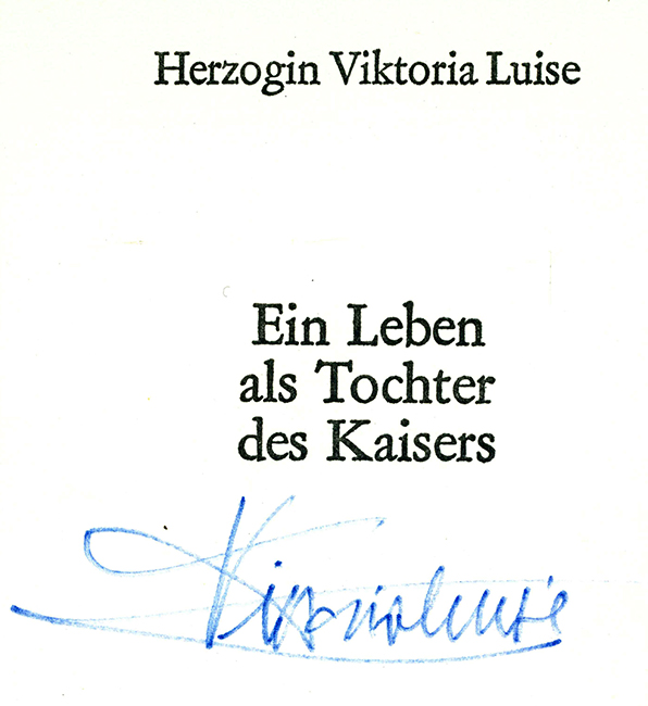 Viktoria Luise (Herzogin zu Braunschweig und Lüneburg, Prinzessin von Preußen), Ein Leben als Tochter des Kaisers. Göttingen u. Hannover, Göttinger Verlagsanstalt 1968. 9. Aufl. Gr.-8°. 381, (3) S. + 32 Tafeln, OLwd. mit illustr. OUmschl. (dieser mit wenigen kl. Randläsuren, Kopfschnitt leicht angestaubt). Sonst gutes Exemplar. * Titelblatt mit großformatiger Signatur der Tochter von Auguste Viktoria u. Kaiser Wilhelm II. – Der erste Erinnerungsband von Viktoria Luise – es folgten weitere Memoirenbände (in meinem Antiquariat teils ebenfalls signiert lieferbar). Umstritten ist, wie viel die Herzogin selbst geschrieben hat oder inwieweit ihr Verleger Leonhard Schlüter diese Memoiren als Ghostwrihter verfasst hat – garantiert echt ist jedoch die Signatur einer zwar umstrittenen, dennoch interessanten Persönlichkeit.