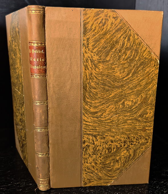 Hebbel, Friedrich, Maria Magdalene. Ein bürgerliches Trauerspiel in drei Akten. Nebst einem Vorwort, betreffend das Verhältniß der dramatischen Kunst zur Zeit und verwandte Puncte. Hamburg, Hoffmann & Campe 1844. Kl.-8°. (14), XLVIII, 126, (2) S., etw. späterer Halblederbd. mit Lederecken, goldgepr. Rücken u. Lederrückenschild sowie Kopfgoldschnitt (stellenw. etw. verblasst). Nur wenige Bl. gering stockfl., insges. sehr gutes Exemplar. EA WG² 7.