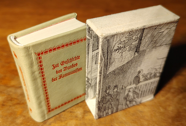 Miniaturbuch – Marx, Karl u. Friedrich Engels, Zur Geschichte des Bundes der Kommunisten. Berlin, Dietz 1989. 4,1 x 5,7 cm. 232, (4) S., OGanzlederbändchen in illustr. Schuber. Tadelloses Exemplar. 1. Auflage.