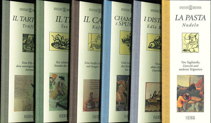 Gastronomica – Genießer Bibliothek. Sammlung von 6 Bänden. Würzburg, Flechsig 2006 – 2007. 9,7 x 24,7 cm. Zus. 696 S., zweifarbig gedruckt, mit Zeichnungen u. histor. Darstellungen, farb. illustr. OPappbde. Verlagsfrische Exemplare. * 1) Il tartufo. Trüffel. Vom Pilz mit dem unvergleichlichen Aroma. 2) Il té. Zur schönsten Stunde des Tages. 3) Il caffè. Kaffee. Eine heiße Leidenschaft mit langer Tradition. 4) Champagne e Spumanti. Vom Geheimnis der feinen Perle im Wein. 5) La pasta. Nudeln. Von Tagliatelle, Gnocchi und anderen Teigwaren. 6) I distillati. Edle Brände. Von der alten Kunst des Destillierens. – Folgende Bände sind einzeln lieferbar – bitte über „Frage an den Anbieter“ bestellen: Nudeln (6,–); Tee (8,–); Trüffel (6,–); Kaffee (20,–)