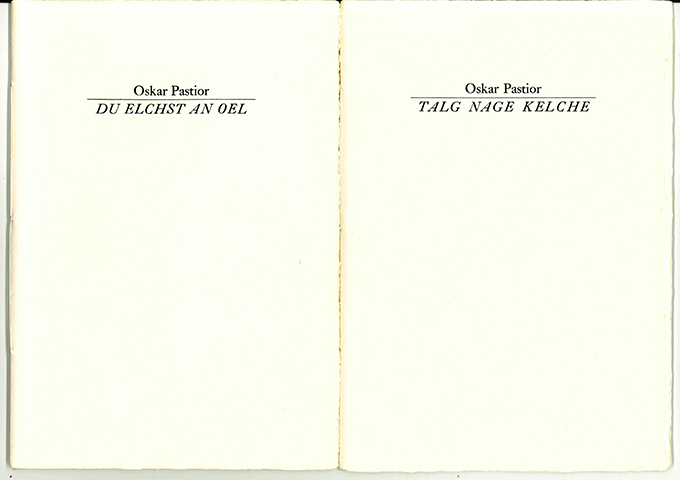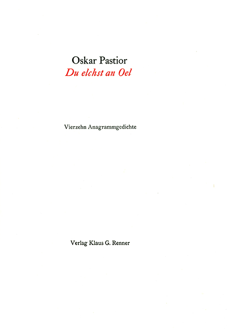 Pastior, Oskar, Du elchst an Oel. Vierzehn Anagrammgedichte. UND: Talg Nage Kehle. Elf Anagramm-Gedichte und ein Anagramm-Bild. Zürich u. Ottiglio, Verlag Klaus G. Renner 2007 u. 2008. 17,5 x 25 cm. 16 + 16 S., OBüttenbroschuren. Tadellose Exemplare. Erstausgaben der korrigierten Gedichte. * Jeweils eins von 49 handschr. nummer. Exemplaren, die nicht für den Handel bestimmt waren. Jeweils im Colophon bzw. auf der Umschlagrückseite mit Stempelsignatur Pastiors. – Gesetzt aus der Cicero Linotype Mediaeval I und vom Blei auf Bütten von Cartiera Amatruda Amalfi gedruckt. – Die Bände enthalten insgesamt 25 korrigierte Gedichte in umgekehrter Reihenfolge, folgend den Erstausgaben aus dem Jahr 1985. Pastior hatte die Gedichte während eines Romaufenthalts geschrieben. Zwei Jahre später erfuhr er von einem Schweizer, der die Anagrammgedichte gründlich nachgezählt hatte, dass diese kleinere und größere „Schäden“ enthielten. So entschieden Pastior und Renner sich zu diesen korrigierten, nun endgültigen Fassungen. Das Anagrammbild wurde hier erstveröffentlicht.