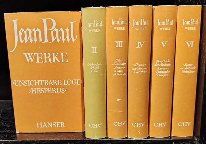 Jean Paul, Werke. (1. Abteilung vollständig). Hrsg. mit Anmerkungen u. Anhängen von Norbert Miller u. Gustav Lohmann. Vier Nachworte von Walter Höllerer. München, Hanser 1963 – 1967 (Mischauflage). Zus. 7712 S., graue OLwdbde. mit dunkelblauen goldgepr. Lederrückenschildern OUmschlägen (davon einer am Rücken verblasst, wenige minim. Läsuren). Sonst tadellos erhaltene Dünndruckausgabe der wichtigsten Werke Jean Pauls. * I. Die unsichtbare Loge. Hesperus. II. Siebenkäs. Fleglejahre. III. Titan. Komischer Anhang zum Titan. Clavis Fichtiana seu Leibgeberiana. IV. Kleinere erzählende Schriften 1796 – 1801. V. Vorschule der Ästhetik. Levana oder Erziehlehre. Politische Schriften. VI. Schmelzles Reise nach Flätz. Dr. Katzenbergers Badereise. Leben Fibels. Der Komet. Selberlebensbeschreibung. Selina. – „Umfassende Studienausgabe“ (Hagen, Handbuch der Editionen, S. 320)
