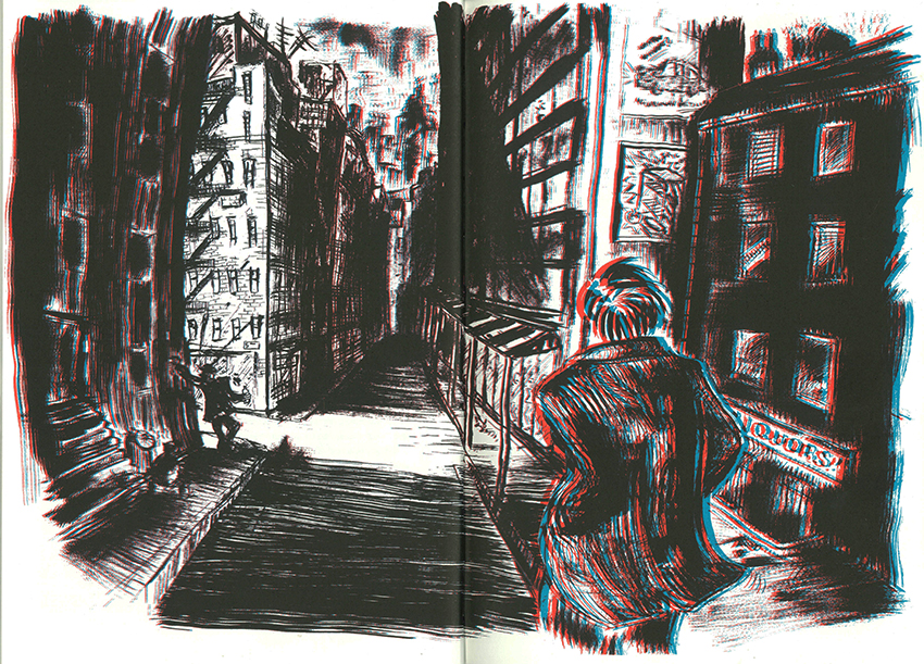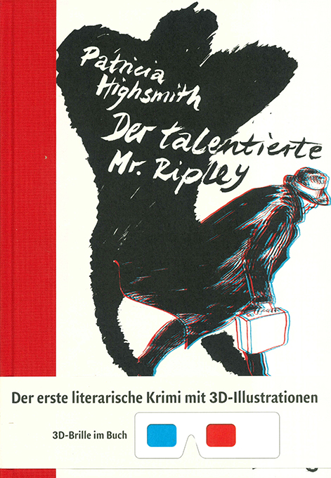 Highsmith, Patricia, Der talentierte Mr. Ripley. Roman. Nachwort von Paul Ingendaay. Mit 32 (ganz- bzw. doppelseit.) dreifarb. 3D-Illustrationen von Alexandra Rügler. Frankfurt u.a., Büchergilde Gutenberg 2012. Gr.-8°. 315, (5) S., farb. gemusterte Vorsätze, beiliegende 3D-Brille, zweifarb. illustr. OHlwd. mit Bauchbinde „Der erste literarische Krimi mit 3D-Illustrationen“. Tadelloses Exemplar im Schuber. 1. Auflage. * Eins von 100 Exemplaren der Vorzugsausgabe, im Colophon nummeriert u. von Alexandra Rügler signiert. Mit einem beilieg. zweifarb. Orig.-Siebdruck (Blattgr. 14 x 21 cm), ebenfalls nummeriert u. signiert.