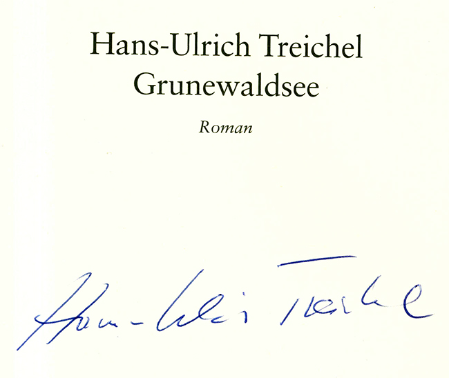 Treichel, Hans-Urlich, Grunewaldsee. Roman. Berlin, Suhrkamp 2010 (2. Aufl. im Jahr der EA). 236, (4) S., OPp. mit farb. ill. OUmschl. Tadelloses Exemplar. * Titelblatt mit großformatiger Signatur des Autors.
