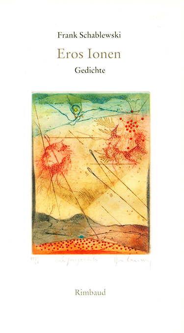Schablewski, Frank, Eros Ionen. Gedichte. Aachen, Rimbaud 2003. 86, (10) S., farb. illustr. OKt. (Kopfschnitt mit wenigen winz. Stockfleckchen). Sonst tadellos. EA.