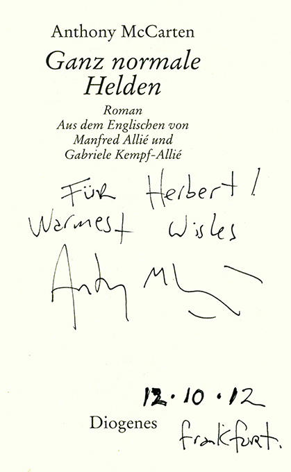 McCarten, Anthony, Ganz normale Helden. Roman. Übertr. von Manfred Allié u. Gabriele Kempf-Allié. Zürich, Diogenes 2012. 453, (11) S., OLwd. mit farb. illustr. OUmschl. Tadelloses Exemplar. DEA. * Titelblatt mit fünfzeil. eigenhänd. Widmung des neuseeländischen Autors.