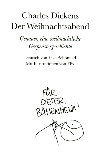 Insel-Bücherei 2010 – Dickens, Charles, Der Weihnachtsabend. Genauer, eine weihnachtliche Gespenstergeschichte. Übertr. von Eike Schönfeld. Mit Illustrationen von Flix. (= Insel-Bücherei 2010). Berlin, Insel 2014. 13,5 x 22 cm (IB-Großformat). 143, (5) S. mit zahlr. (überwieg. ganzseit.) farb. Bildern, farb. illustr. OPp. Sehr gutes Exemplar. EA. * Titelblatt mit Grußwidmung u. origineller Signatur des Comiczeichners u. Cartoonisten Flix. – Beiliegt das Verlagszettelchen zu diesem Band.