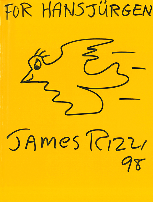 Rizzi, James, Mein New York Kochbuch. Rezepte von Peter Bührer. München, Mary Hahn bei Herbig 1998. 4. Aufl. 4°. 168 S. mit sehr zahlr. (teils ganzseit.) farb. Illustrationen u. Vignetten, farb. illustr. OPp. mit OUmschl. Tadelloses Exemplar. * Flieg. Vorsatz mit großformatiger Widmung u. Orig.-Benzinstift-Zeichnung (″Rizzi-Bird“) von James Rizzi.