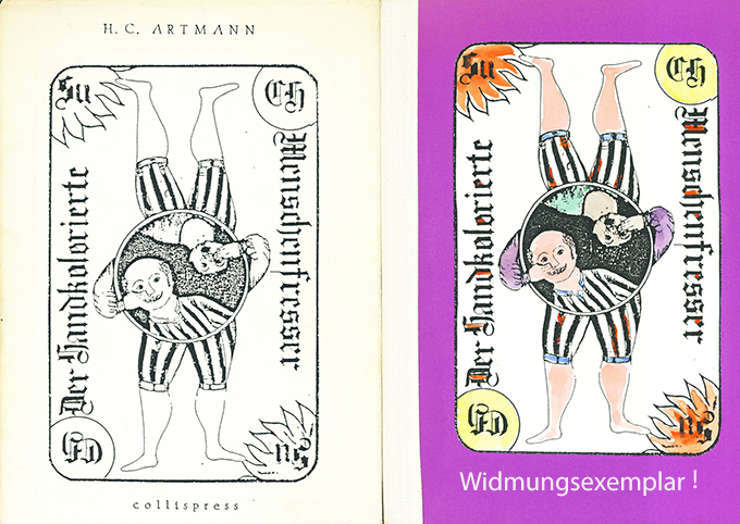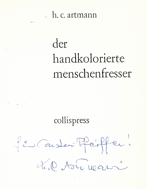 Artmann, H.C., Der handkolorierte Menschenfresser. Mit 9 handkolorierten Illustrationen u. handkolor. Einbandzeichnung von Patrick Artmann. Nachdruck der Ausgabe 1968 in verändertem Format. Stuttgart, Collispress (1980). 15 x 21 cm. (42 S.), farb. illustr. OHlwd. mit illustr. OUmschl. (dieser etw. nachgedunkelt u. mit Randläsuren). Sonst tadelloses Exemplar in der besseren Einbandvariante (statt broschiert). * Titelblatt mit zweizeil. eigenhänd. Widmung des Dichters.