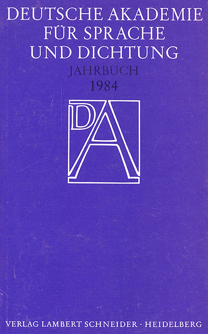Jandl, Ernst, Dichtung, bisweilen, ist ein blutiges Geschäft. Dankrede. Erstdruck (S. 135 – 140) in: Deutsche Akademie für Sprache und Dichtung. Jahrbuch 1984. Heidelberg, Lambert Schneider 1985. Gr.-8°. 208 S., OKlappenkart. Gutes Exemplar. * Weit. Beitr. von Domin (Zum Tod von Manès Sperber), Härtling (Helft den Kindern, helft den Büchern!), Heissenbüttel (Laudatio auf Ernst Jandl), Koeppen (Ein Bruder der Massen war er nicht. Zum Tode von Uwe Johnson), Krolow (zum Tod von Rudolf Hagelstange) u.a.