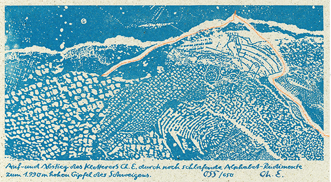 Marginalien, Heft 2 / 2020 (Nr. 237, Vorzugsausgabe). Zeitschrift für Buchkunst und Bibliophilie. Hrsg. von der Pirckheimer-Gesellschaft. Bucha, quartus 2018. Gr.-8°. 127 S. mit Abbildungen + 8 S. typograph. Beilage (Buchdruck auf getöntem Papier), OKlappenkart. Tadellos. * Mit einer beilieg. Orig.-Graphik „Auf- und Abstieg des Kletterers CH.E. durch noch schlafende Alphabet-Rudimente zum 1.990 m hohen Gipfel des Schweigens“ (650 Ex.) von Christian Ewald, vom Klischee auf einem Heidelberger Zylinder gedruckt u. mit einem rosaroten Faden benäht. Von Ewald nummeriert u. monogrammiert. – Aus dem Inhalt: Sammeln als Kunst; Der Tiefdruck; Marsyas und Apoll – eine blutrünstige Geschichte; Die Zeitschrift „Lancelot“; Die Katzengraben-Presse. – Typographische Beilage: „Ich seh den Wald vor lauter Blättern nicht!“. Exzerpiert von Jürgen Engler, kommentiert von Matthias Gubig.