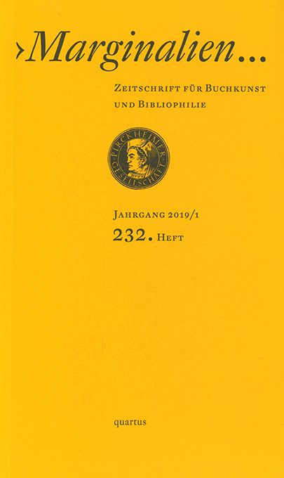 Marginalien, Heft 1 / 2019 (Nr. 232, Vorzugsausgabe). Zeitschrift für Buchkunst und Bibliophilie. Hrsg. von der Pirckheimer-Gesellschaft. Bucha, quartus 2019. Gr.-8°. 119 S. mit Abbildungen + 12 S. typograph. Beilage (Buchdruck auf getöntem Papier), OKlappenkart. Tadellos. * Mit einem beilieg. Orig.-Farbsiebdruck „Lederdämon“ (600 Ex.) von Kay Voigtmann, von diesem nummeriert u. signiert. – Außerdem mit farb. Graphik von Otto / Kleiner Planeten-Verlag: „Garto Potchi. Bücher machen unter extremen Bedingungen“, nummeriert (170 Ex.) u. signiert. – Aus dem Inhalt: Bilderbücher aus Stein. Bibliophile Schätze in den Moldauklöstern Rumäniens; Die Konfigurationen der Alice Liddell. Über Exlibris aus dem Wunderland; Der Plakat-Papst. Abschied von Hellmut Rademacher; Heinz Trökes. – Typographische Beilage: Georg Klein, Das Kissen. Gestaltet u. kommentiert von Matthias Gubig.