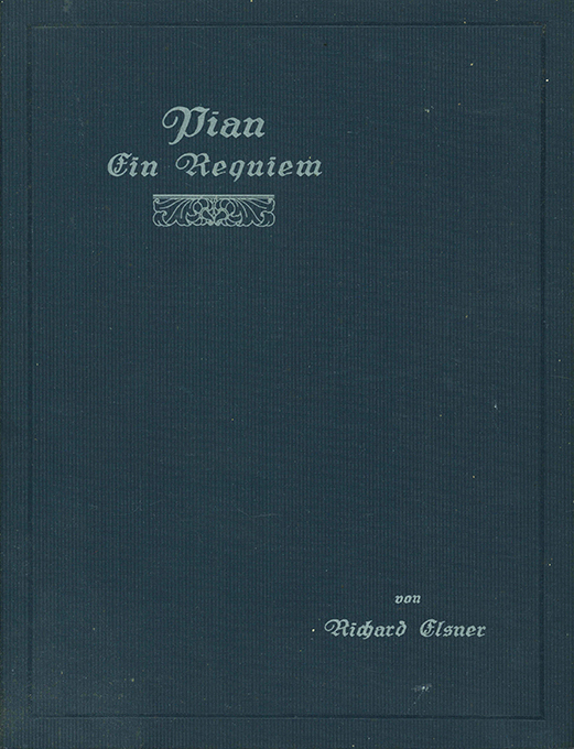 Elsner, Richard, Pian. Ein Requiem. (Berlin, Verlag der deutschen Kulturvereinigung) 1919. 20 x 25,5 cm. 55, (5) S. + 40 Tafeln mit zahlr. Fotografien, OLwd. (wenige winz. Fleckchen). Gutes Exemplar. EA. * Vortitelblatt mit fünfzeil. eigenhänd. Widmung des Autors. – Elsner (1883–1960) war ein deutscher Lehrer, Schriftsteller, Dramatiker und Literaturkritiker.