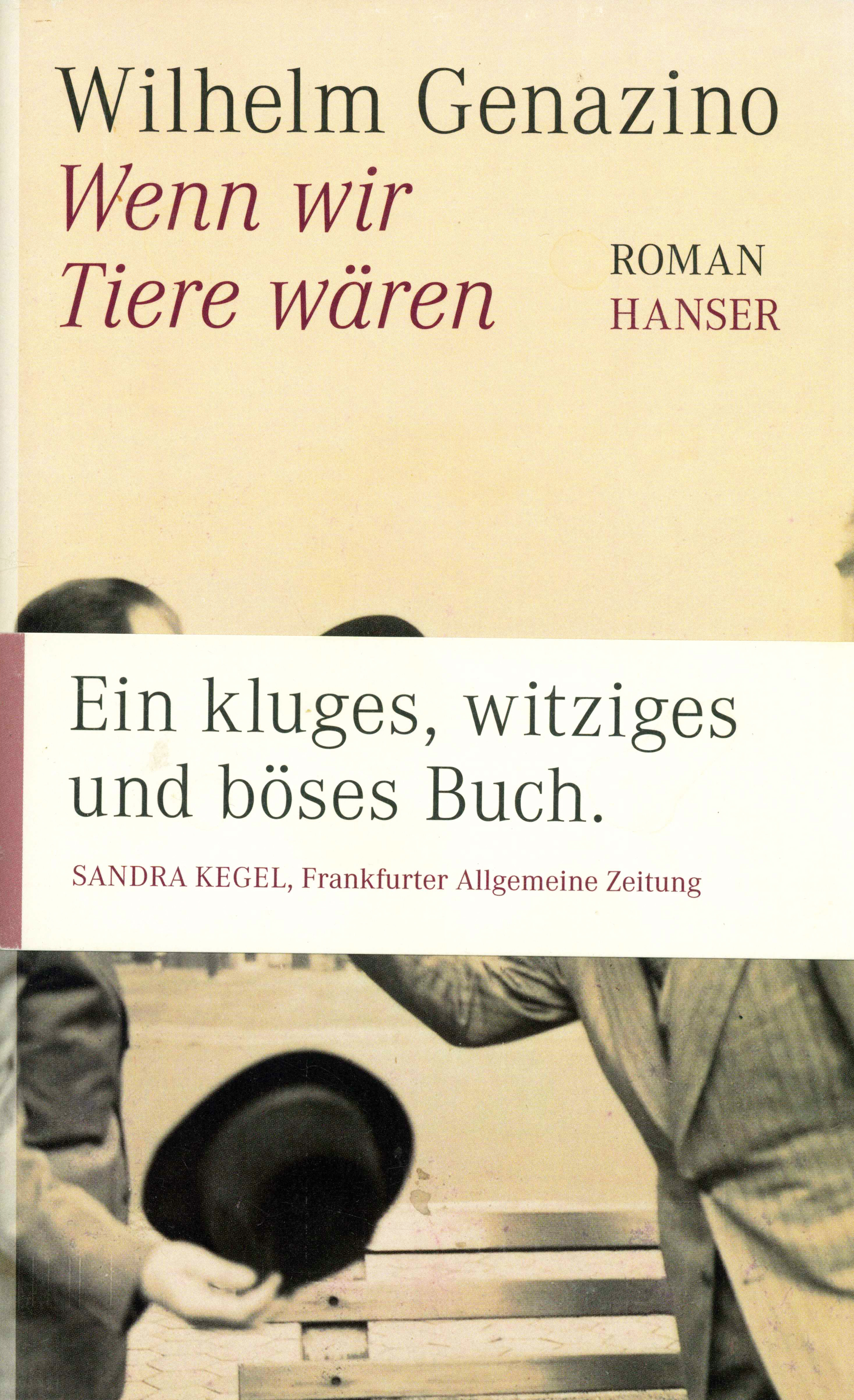 Genazino, Wilhelm, Wenn wir Tiere wären. Roman. München, Hanser 2011. (4. Aufl.) 158, (2) S., OPp. mit illustr. OUmschl. u. Bauchbinde „Ein kluges, witziges und böses Buch“.