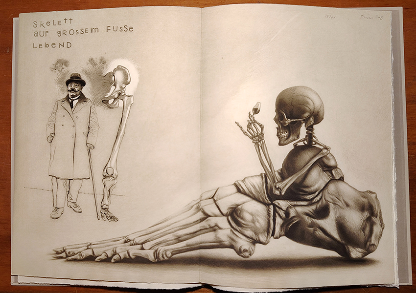 Tripp – Cami, Pierre Henri, Das verschwundene Skelett. Übertr. von Michael Schulte. Mit einer beiliegenden, doppelblattgr. Orig.-Radierung „Skelett auf großem Fuße lebend“ von Jan Peter Tripp. Ottiglio u. Zürich, Renner 2003. 25,5 x 36 cm. 2 Bl., (16 S.), 2 Bl., 1 Graphikbogen, OPp. Tadelloses Exemplar. DEA. * Eins von 60 (ges. 72) nummer. Exemplaren, im Druckvermerk von Tripp u. Schulte signiert. Die Radierung (Kaltnadel, Roulette u. Ätzung; Plattengr. 35 x 50 cm) wurde auf Bütten gedruckt u. von Tripp nummeriert, signiert u. datiert. Satz des Textes aus der Goudy Catalogue Serie 268, in der Offizin Haag Drugulin auf Hahnemühle-Bütten gedruckt. Handeinband von Horst Zeman.