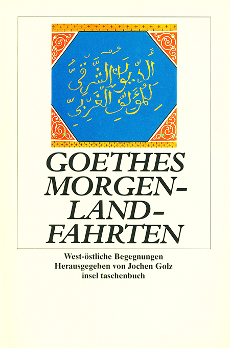 Goethe – Golz, Jochen, Goethes Morgenlandfahrten. West-östliche Begegnungen. (= insel taschenbuch 2600). Frankfurt u. Leipzig, Insel 1999. 305, (5) S. mit zahlr. (teils farb.) Abbildungen, farb. illustr. OKt. Tadelloses Exemplar. EA.