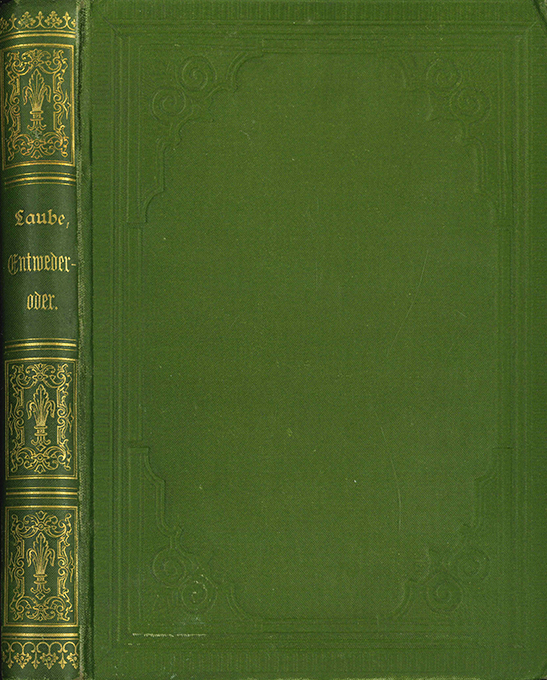 Laube, Heinrich, Entweder – oder. Eine Erzählung. Braunschweig, Westermann 1882. Kl.-8°. (4), 284 S., blindgepr. OLwd. mit goldgepr. Rücken u. marmoriertem Schnitt (Kanten minim. berieben, Innenfalz gelockert). Gutes Exemplar. Selten. EA WG² 53.