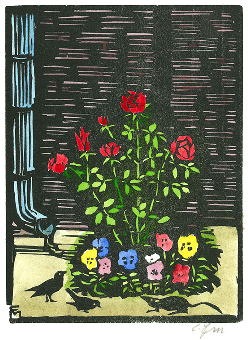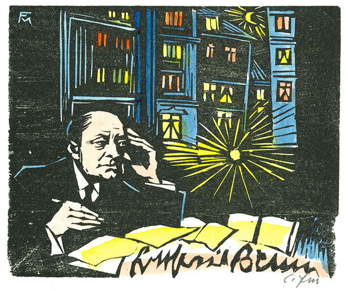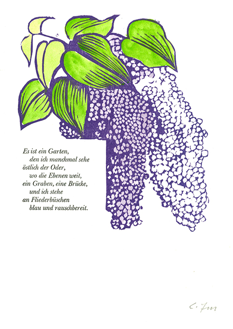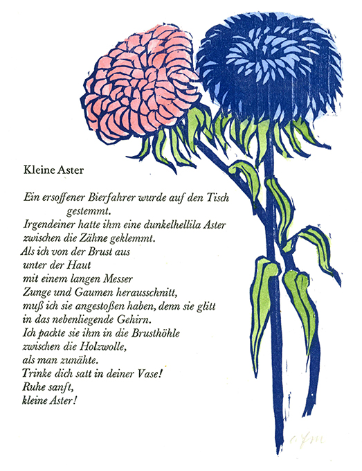 Felixmüller – Rübe, Werner, Benn’s Garten. Ein Essay. Mit elf Orig-Holzschnitten von Conrad Felixmüller, meist zu Versen Gottfried Benns. Kransberg 1976. 18 x 23,5 cm. 1 Bl., (24) einseit. bedr. Bl., 1 Bl., hellgrüner OBüttenpappbd. mit Holzschnitt-Vignetten auf beiden Deckeln u. unbedr. Pergamentpapierumschlag (nur dieser stellenw. nachgedunkelt). Das Buch ansich in makellosem Zustand u. in einem Schuber. EA. Söhn 700 M (700-710). Spindler 70.24. * Erstes Buch der Edition Frankfurt in der Petri Presse. Nr. II von (ges. 185 einschl. Mitarbeiterex.) römisch nummer. Exemplaren der Vorzugsausgabe, in welcher nicht nur der Druckvermerk von Felixmüller mit Tinte signiert, sondern zudem sämtliche Holzschnitte vom Künstler monogrammiert wurden . Die – selbstverständlich von den Stöcken gedruckten – Holzschnitte wurden teils farbig gedruckt, teils von Conrad Felixmüller, Londa und Enkelin Sybille handkoloriert. Der Text des Sammlers und Benn-Sachkenners Prof. Werner Rübe über das Verhältnis Gottfried Benns zu Blumennamen wurde aus der Baskerville Antiqua u. Kursiv von Fritz Barkowsky von Hand gesetzt u. auf kräftiges BFK Rives-Bütten abgezogen.