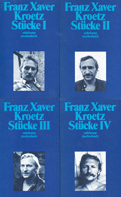 Kroetz, Franz Xaver, Stücke. (= suhrkamp taschenbuch 1677 – 1680). Vier Bände. Frankfurt, Suhrkamp 1989. Kl.-8°. Zus. 2142 S., OKartonbde. mit Portraitfotos des Dichters. Tadelloses, ungelesenes Exemplar aus dem Besitz von Marie Theres Relin, der damaligen Frau von Kroetz.