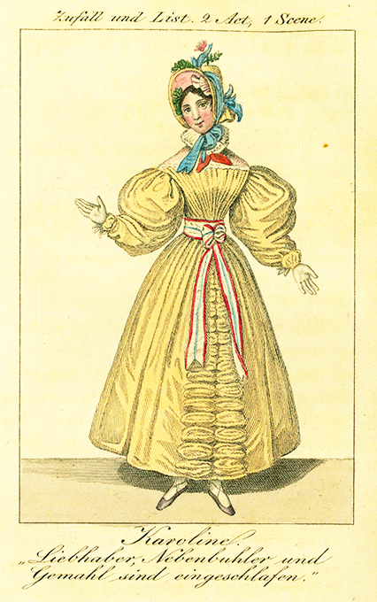 Almanach – Kurländer, F.A. von, Lustspiele oder dramatischer Almanach für das Jahr 1835. Fünf und zwanzigster [25.] Jahrgang. Leipzig, Baumgärtner (1834). 12°. VIII, (2), 324, (6) S. + 6 handkolorierte Kupfertafeln (Figuren aus den Theaterstücken), lithogr. OPp. (fleckig, bestoßen, Rücken mit starken Gbrsp.) Das Textpapier stockfl., die Tafeln sind davon nicht betroffen. Insges. noch wohlerhalten. Köhring 18. Lanckoronska-Rümann 123f. * Enthält vier Stücke von Kurländer: „Hanns als Schildwache“, „Die Altistinn“, „Zufall und List“ u. „Haushaltung einer Dichterinn“. – Kurländer gab 27 Jahre lang seinen Almanach heraus, als Gegenentwurf zu Kotzebues „Almanach dramatischer Spiele zur geselligen Unterhaltung auf dem Lande“. Lanckoronska-Rümann (S. 124) zu den Kupfern: „Sämtliche dieser Theaterfiguren sind reizend gezeichnet und sehr sorgfältig koloriert.“