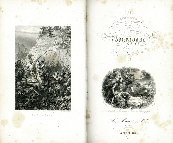 Frankreich – Burgund – Valentin, P., Les ducs de Bourgogne. Histoire des XIVe et XVe siècles. Tours, Mame 1846. 3. Aufl. (4), 372 S. + 4 Stahlstiche (davon 2 auf dem gest. Doppeltitel), blindgepr. Ganzlederbd. der Zeit mit goldgepr. Rücken u. marmor. Schnitt (geringfügig berieben u. bestoßen). Papier etw. stockfl. Insges. gutes Exemplar.