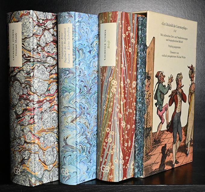 Sterne, Laurence, Werke in drei Bänden + Begleitheft. Übertr. u. mit Anmerkungen von Michael Walter. Mit einem dokumentarischen Anhang, Anmerkungen, Kommentaren, Vor- u. Nachwort von Michael Walter, Anke Albrecht u. Wolfgang Hörner. Berlin, Galiani 2018. 852, (6), 441, (7) u. 594, (14) S., Begleitheft 46, (2) S. mit farb. Abbildungen, OPappbde. (Beiheft: OKart.) mit handmarmor. Überzugspapieren. Tadellos. Im farb. illustr. Schmuckschuber. 1. Auflage. * I. Leben und Ansichten von Tristram Shandy, Gentleman. II. Eine empfindsame Reise; Briefe an Eliza; Tagebuch des Brahmanen; Satiren; Kleine Schriften. III. Die Briefe. Begleitheft: Wolfgang Hörner, Widersprüche des Menschseins. Laurence Sterne. Eine biographische Skizze. – Diese erste deutsche Laurence-Sterne-Werkausgabe enthält zahlreiche Erst- u. Neuübersetzungen. – „Ein absoluter Meilenstein der deutschen Übersetzungsgeschichte.“ (Friedhelm Rathjen) – „Michael Walter holt Sternes Sprachkapriolen ins Deutsche wie kein anderer zuvor.“ (Focus) – „Ein Glücksfall der Literaturpflege“ (FAZ)