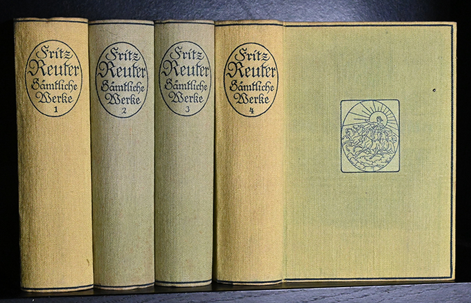 Reuter, Fritz, Sämtliche Werke in zwölf Bänden (diese in 4 Bdn.) Vollständige, kritisch durchgesehene u. erläuterte Ausgabe mit Biographie u. Einleitungen von Karl Theodor Gaedertz. Leipzig, Reclam (ca. 1900). Kl.-8°. Zus. 3564 S. + zahlr. Tafeln, 1 gefalt. Faksimile, OLeinenbde. (diese stellenw. verblasst, 2 Bde. mit zahlr. hellen Flecken), Kopffarbschnitte. Insges. wohlerhalten. Nicht bei Hagen.