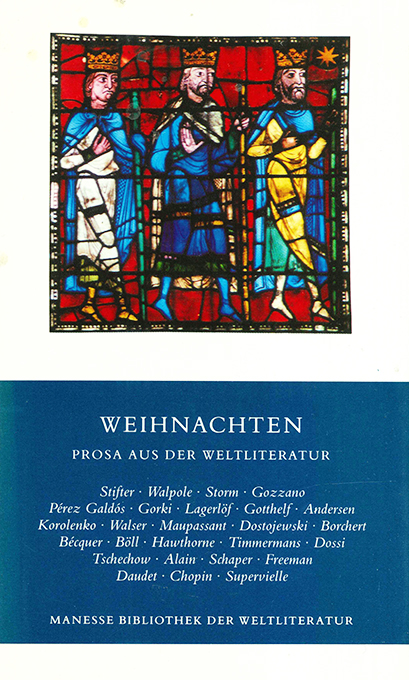 Weihnachten – Heinser, Berhard (Hg.), Weihnachten. Prosa aus der Weltliteratur. (= Manesse Bibliothek der Weltliteratur). Zürich, Manesse 1987. Kl.-8°. 499, (5) S. + 10 Farbtafeln (Bilder des Herz-Jesu-Fensters der Kathedral von Chartres), illustr. Vorsätze, OLwd. mit goldgepr. Rückentitel, Kopffarbschnitt u. farb. illustr. OUmschl. (dieser am Rücken verblasst). Vortitelbl. mit Widmung eines Thomas [ungenannt an die Schauspielerin Marie Theres Relin], sonst sehr gutes Exemplar. EA. * Texte von Andersen, Böll, Daudet, Dostojewski, Gotthelf, Gozzano, Lagerlöf, Stifter, Tschechow, Walpole u.a.
