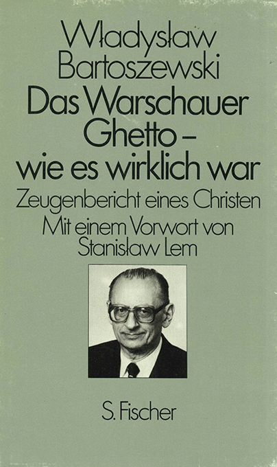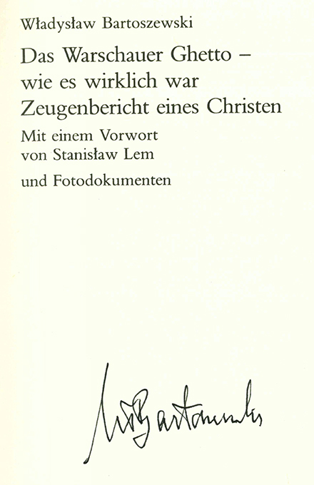 Ghetto, Warschauer – Bartoszewski, Wladyslaw, Das Warschauer Ghetto – wie es wirklich war. Zeugenbericht eines Christen. Mit einem Vorwort von Stanislaw Lem und Fotodokumenten. Erweiterte Ausgabe. Frankfurt, S. Fischer 1986. 139, (5) S. + 16 Tafeln, OLwd. mit illustr. OUmschl. (dieser leicht berieben). Sonst tadellos. * Titelblatt vom vielfach, u.a. mit dem Friedenspreis des Deutschen Buchhandels, ausgezeichneten Autor signiert.